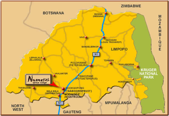 A stone’s throw away from Nuanetzi Private Game Lodge is the Nylsvlei Nature Reserve (3,100 ha), 20Km south of Mookgophong, a flood plain in the Nyls River, renowned for its abundant bird life. There are hot springs of about 39°C in the nearby Waterberg.